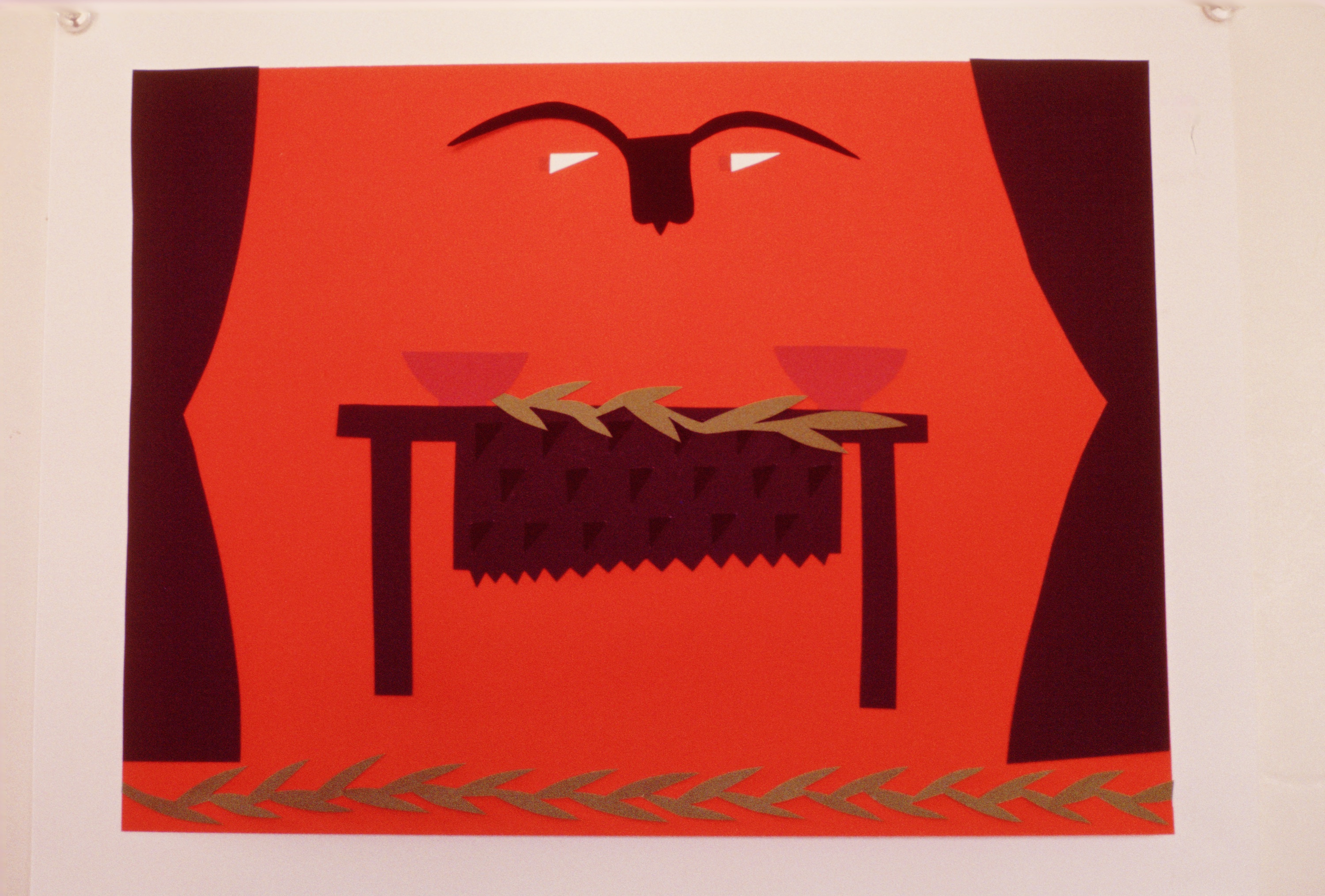 Untitled (decorated table between curtains skull on wall)